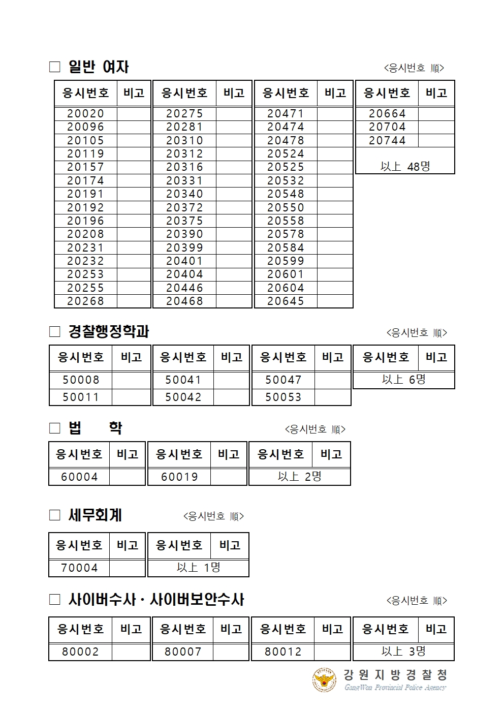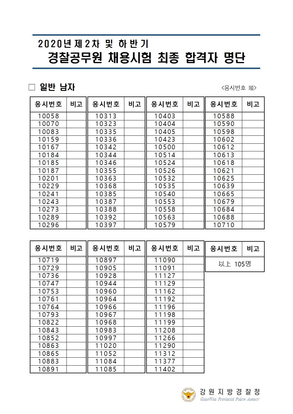 2020년 제2차 및 하반기 경찰공무원 채용시험 최종 합격자 발표